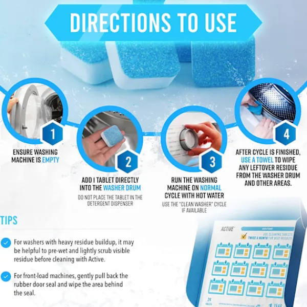 Produktbeskrivning 1. Fungerar med alla tvättmaskiner 2. Naturliga brustabletter är säkra för septiktankar och tillverkade med mindre förpackning. Jämför med flytande avkalkningsmedel och våtservetter som skapar onödigt avfall 3. Omedelbar rengöringskraft – Aktiv Självrengöringstablett rengör så att du inte behöver borsta och torka dina tvättmaskiner. När de utsätts för vatten bryts de ner till djuprengörande pulvertvättmedel som bryter ner smuts och kalkavlagringar 4. 24-pack – Varje förpackning innehåller 24 stycken. 5. Luktborttagare – Inga fler illaluktande tvättmaskiner. Avkalkningsmedlet fräschar upp din tvättmaskinskorg, gummipackning och interna delar så att dina kläder kommer ut rena och luktar fräscht.