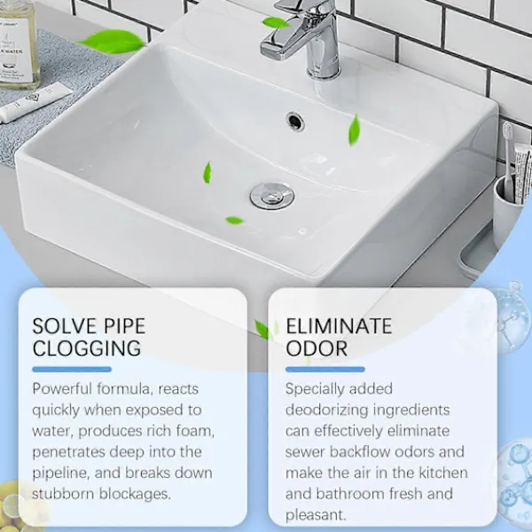 **Snabbt Verkande Formula**: Våra rörrengöringstabletter löses snabbt upp i varmt vatten och skapar ett kraftfullt skum som tränger djupt in i rören för att effektivt bryta ner envis fett, hår och andra blockeringar.