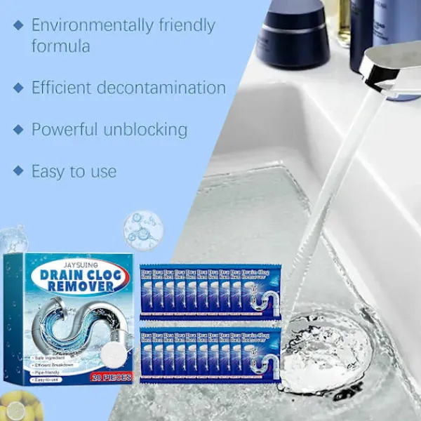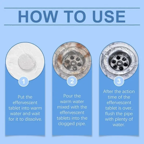 4 **Lätt att Använda**: Släpp helt enkelt en tablett i varmt vatten, låt den lösas upp och häll lösningen i det blockerade röret. Spola med vatten efter verkningstiden för optimala resultat.