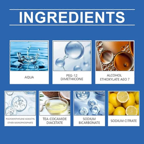 Vår tet skumrengöring innehåller PEG-12 polydimetylsiloxan, fettalkoholpolyoxietyleneter AEO 7. Den kan rengöras effektivt, lämnar inga spår, mild formulering, bekväm upplevelse, stark tillämpbarhet, säker och pålitlig. Sättet att använda den är enkelt: använd en tet-borste för att skrubba fläckarna och skummet på insidan av tet, och skölj sedan med vatten. Låt skummet sitta i 5-10 minuter och vänta på att skummet ska lösas upp. Applicera lämplig mängd av denna produkt jämnt på tet:s innervägg och kant. Och kan hjälpa till att ta bort fett och smuts från tet. Propylenglykolbutyleter bryter ner smuts och avlagringar på djupet, vilket förbättrar rengöringsförmågan. LAURETH-7 ger en skonsam rengöringseffekt och håller tet-ytan slät.