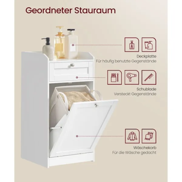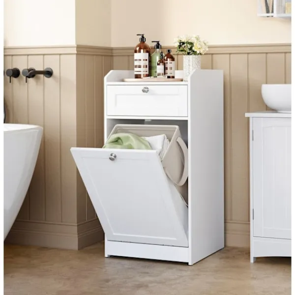 Lätt att organisera: Stort skåp med tvättkorg hjälper till att hålla ditt badrum krångligt.