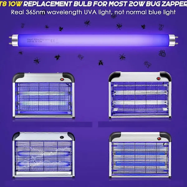 [Passande Modeller]: T8 10W ersättningslampor för Aspectek, Liba, Micnaron, Lulu Home de flesta 20W elektriska insektsdödare. Nr 97341-CHN-1; Vänligen mät och bekräfta lampans storlek på insektsdödaren innan du köper [365Nm Våglängd]: Använd en toppvåglängd på 365nm ultraviolett ljus eftersom insekter är särskilt attraherade av ljus i det intervallet; Denna specifika våglängd faller inom UV-A-spektrumet, vilket är känt för att vara mycket attraktivt för myggor och andra flygande insekter [Långvarig]: Långvariga UV-lampor för insektsdödare, mer än 3000 timmar, för att uppnå bästa möjliga effekt rekommenderas det att byta ut T8 10W UV-lamporna efter cirka 3-4 månaders kontinuerlig användning [Lampstorlek]: du kommer att få 10-pack insektsdödarlampor; Lampstorlek: 13L x 1W x 1H tum, total längd inklusive stift på båda sidor är 13,5 tum; Effekt: 10W