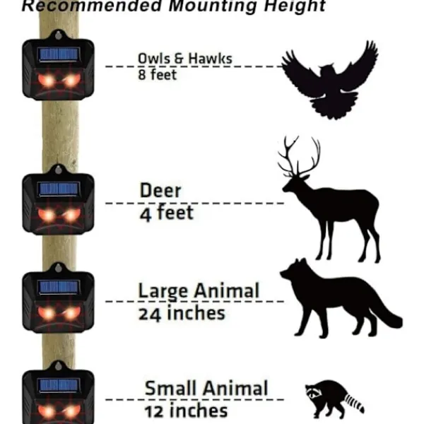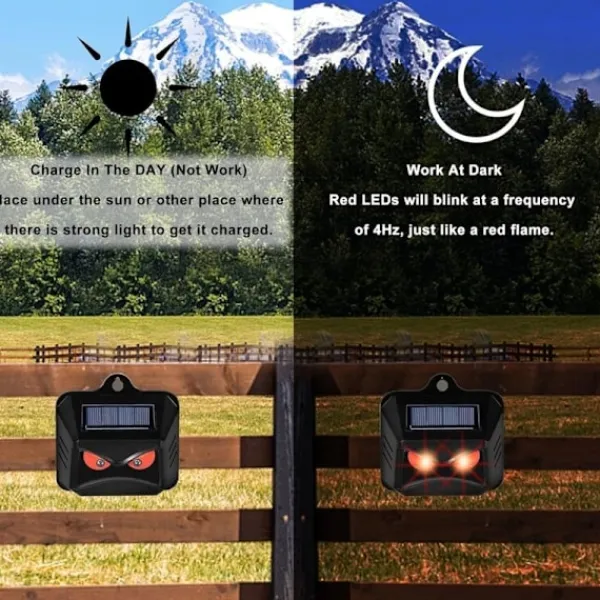 Förebyggande skydd mot vilda djur: Våra repellenter är effektiva mot fauna som tvättbjörnar, rådjur, rävar och vildsvin. Enheten avger automatiskt ljussekvenser på natten och i skymningen, vilket permanent avskräcker oönskade djurbesökare. Bevisad effektivitet: Rött indikerar fara för djur eftersom det finns få i naturen. Det är därför våra enheter använder rött ljus för att skydda djur. Mångsidig: Oavsett om det är på åkrar, i skogar, trädgårdar, garage eller lador kan fauna vara ett problem på många platser. Våra djurrepellenter levereras med en dragkedjeförsedd fästanordning så att den kan fästas nästan var som helst. Kan även fästas med skruvar Energieffektivitet: Eftersom våra repellenter för vilda djur drivs av solenergi, placera helt enkelt enheten där faunan ofta angriper – de är redo att användas, utan elräkningar. Batteriet räcker cirka 12 månader vid kontinuerlig drift (beroende på batteriet) ingår ej! Respektfullt mot djur: Våra repellenter för vilda djur är skonsamma alternativ till traditionella djurrepellenter. Djuren skräms bara bort av det röda ljuset. De skadas inte eller störs av vissa frekvenser eller ljud【pl】