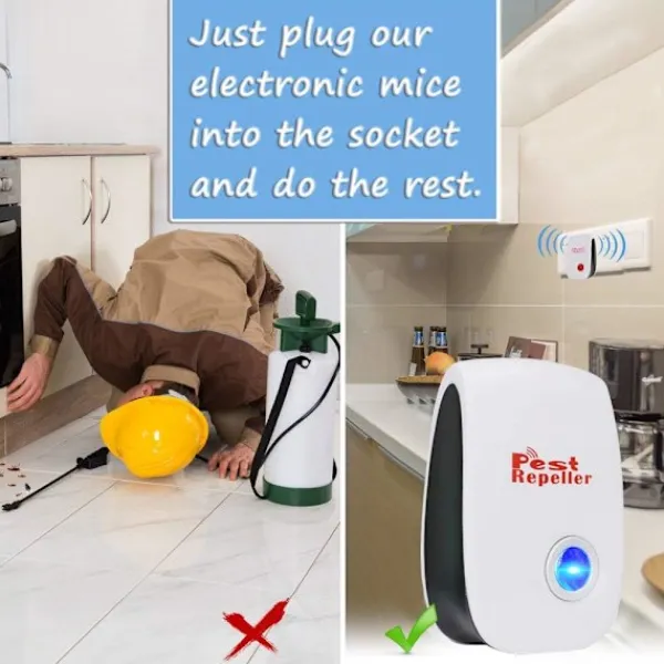 Avvisande medel mot gnagare, till skillnad från musfällor eller kemikalier är ultraljudsapparater effektiva, miljövänliga och riskfria. Inga kemikalier eller sprayer skadar dina husdjur. Inget ljud, det stör dig inte. Ingen strålning, säkert. Lätt att använda, bara anslut den till uttaget.