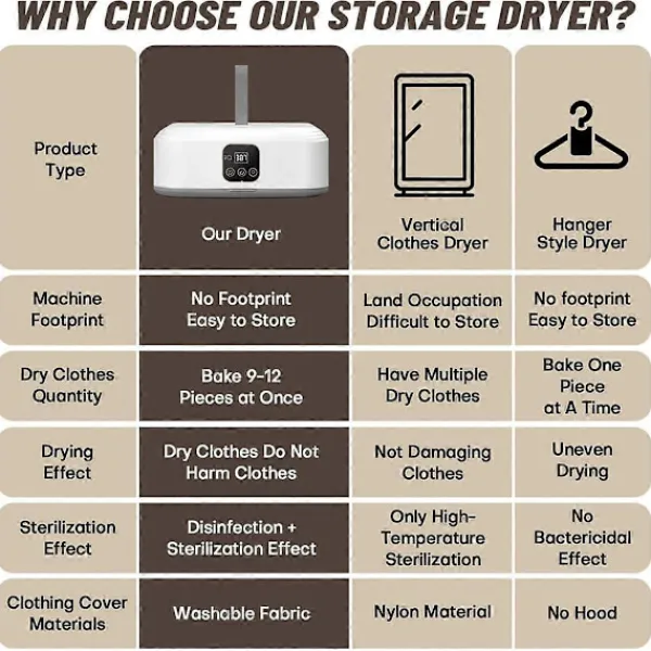 [Snabb och Skonsam Torkning] Klädtork erbjuder höghastighetstorkning med mångsidiga värmelägen. Med ett skonsamt läge lämpligt för ömtåliga tyger (40-50° varm vind) och en 8-timmars automatisk avstängningsfunktion, plus ett varmluftsläge (50-60°) avsett för snabbare torkning av bomull, linne, nylon och polyester, är det en mäktig liten torktumlare perfekt för enkel och effektiv torkning![Tyst och Tidsinställd Torkning] Med en inbyggd timer och tyst läge är torktumlaren utformad för att göra din dagliga tvätt till en barnlek. Ställ in torktiden efter tjockleken på dina kläder och njut av en fridfull miljö. Bekvämt styrd på distans, det är en användarvänlig apparat, särskilt gynnsam för äldre användare, för dagligt bruk.[ och Bärbar] Mini klädtork är din perfekta resekompis eller för användning i små lägenheter, studentrum och husbilar. Den är , lätt att flytta och perfekt för torkbehov på språng. Kompakt i storlek, den säkerställer att du har en lösning för att torka kläder när som helst, var som helst.[Ren och Flexibel Torkning] Vår bärbara torktumlare har ett integrerat LED UV-system för effektiv rengöring. Timerfunktionen tillåter användare att ställa in torktiden efter eget önskemål – välj mellan 1, 2 eller 8 timmar för en anpassad, ren och snabb torkupplevelse.[Kostnadseffektiv Torkning] Torktumlaren erbjuder en prisvärd, energibesparande lösning för dina torkbehov. Denna kompakta maskin använder mindre energi, vilket gör den till ett ekonomiskt alternativ till större torktumlare. Den är perfekt för att torka en liten mängd kläder och bra för dina resor.