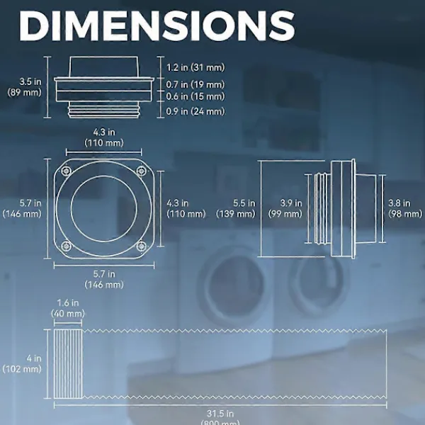 Lufttät försegling för optimal prestanda: Satsen innehåller en 2,6 fot lång aluminiumfolieslang med 4 tums diameter som ger en lufttät försegling, vilket säkerställer effektivt luftflöde och ventilation. Denna funktion hjälper till att upprätthålla torktumlarens prestanda samtidigt som den förhindrar luftläckor och energiförlust.