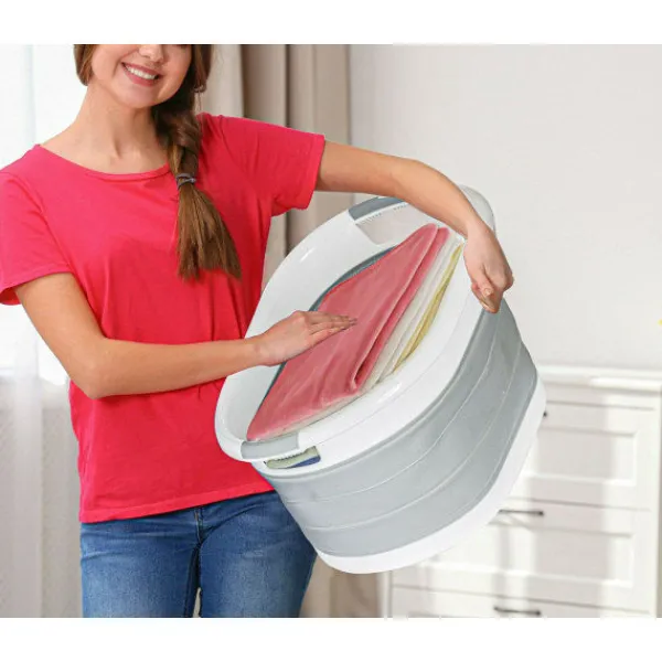 En enkel lösning när du behöver spara utrymme. När du använt tvättkorgen kan den fällas ihop för förvaring. Stor kapacitet på 40 liter. Tillverkad av robust plast för att säkerställa lång livslängd. Storlek ca: 53 x 24 x 38 cm