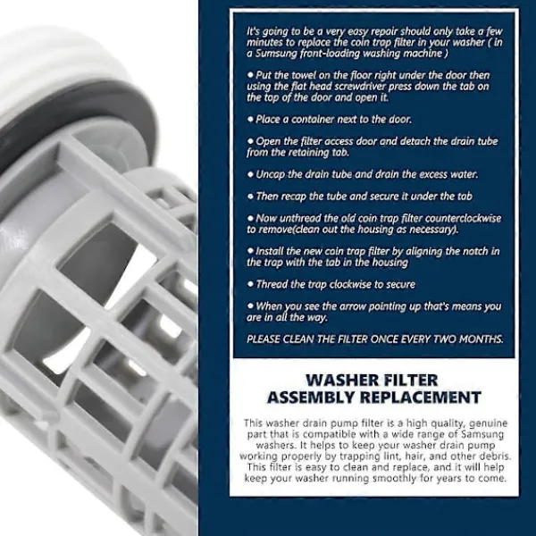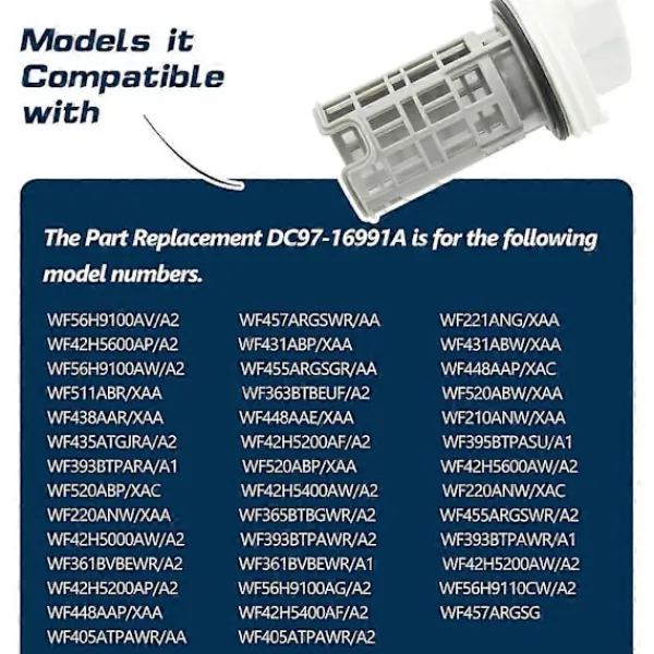 [Funktion] Detta tvättmaskins avloppspumpsfilter hjälper till att hålla din tvättmaskins avloppspump fungerande korrekt genom att fånga upp ludd, hår och annat skräp. Förlänger livslängden på din tvättmaskin.[Kompatibla modeller] Kompatibel med för WF42H5600AP, WF42H5000AW, WF42H5600AW/A2, WF42H5000AW/A2, WF42H5600AP/A2. Ersätter 4000059 AP5800143 PS8764284 EAP8764284 etc.[Hög kvalitet] Tillverkad av högkvalitativa ABS-plastmaterial, noggrant testade för att uppfylla artikelnummerstandarden. Inte lätt att deformera, lång livslängd.[Lätt att installera] Enkel och bekväm installation, vilket sparar tid och pengar. Rengör filtret en gång varannan månad.