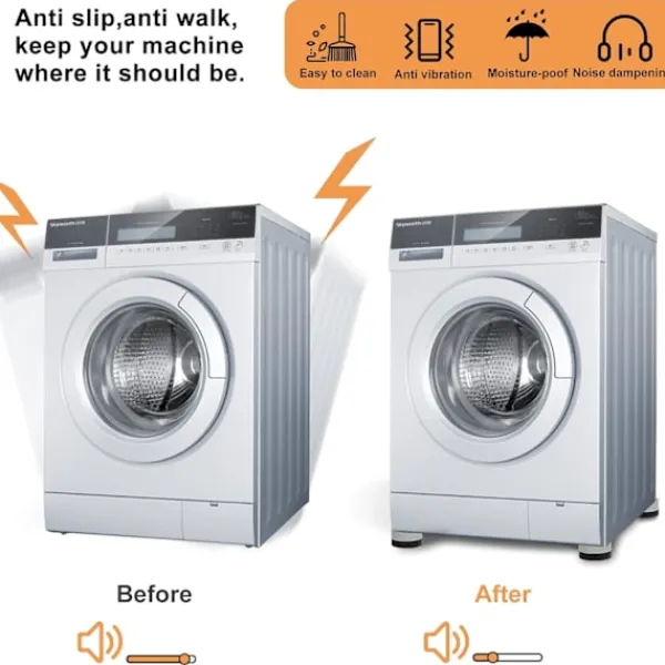 【 ANTI VIBRATION】:Flexibelt naturgummi, perfekt material för vibrations- och bullerisolering. 4 fotdynor frikopplar din tvättmaskin eller torktumlare från golvet, undvik vibrationer eller ljudöverföring, håll den tyst för din familj och grannarna. Öka