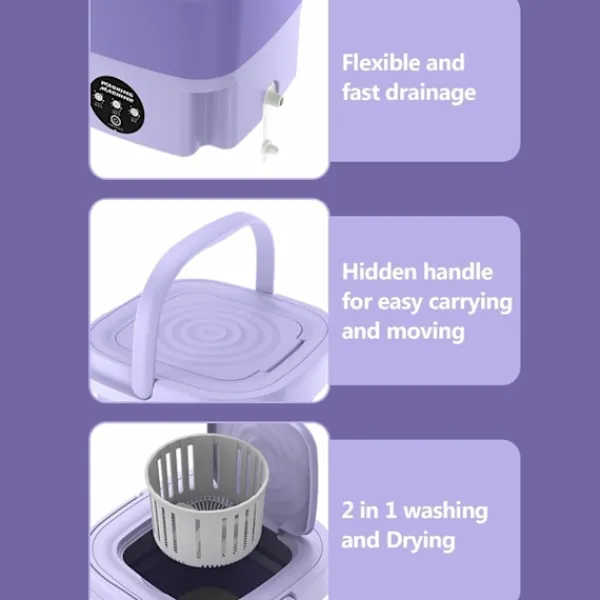 【Bekväm att bära】 Oavsett om du bor i lägenheter, sovsalar eller vårdhem, eller om du gillar camping, resor eller turism, är denna vikbara tvättmaskin en utmärkt lösning för dina tvättbehov. Den är lätt att förvara och transportera, och den kan tvätta kläder snabbt och effektivt.