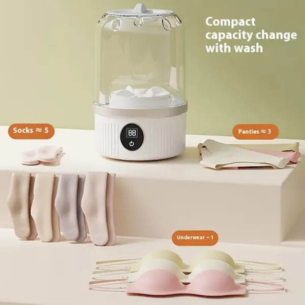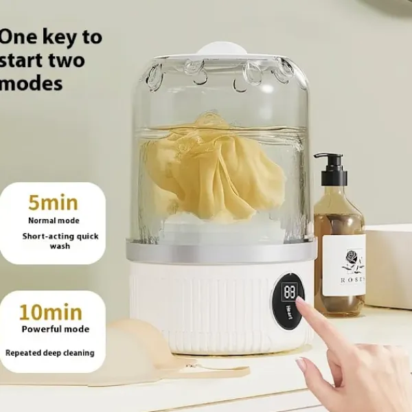 [Kraftfull och Skonsam Rengöring] Den förbättrade underklädestvättmaskinen erbjuder den perfekta balansen mellan kraft och skonsamhet. Avancerad tvättteknik tar effektivt bort fläckar från behåar, underkläder och babykläder utan att skada tyget. Den skonsamma och noggranna tvättcykeln skyddar elasticiteten och kvaliteten på känsliga material, så att dina kläder håller sig i toppskick efter varje tvätt. [Trådlös laddning för optimal bekvämlighet] Säg adjö till sladdtrassel! Denna trådlösa minitvättmaskin drivs av uppladdningsbara batterier, så du kan använda den var som helst utan att vara beroende av ett uttag. Oavsett om du är i en husbil, på campingen eller i ett utrymme utan ström, är tvättkoppen alltid redo för en problemfri rengöring. [Bärbar och platsbesparande design] Denna kompakta tvättkopp är speciellt utformad för bärbarhet och enkel förvaring. Dess lilla storlek är perfekt för små lägenheter, studentrum och på resande fot. Den får enkelt plats i din resväska eller i ett hörn av badrummet, vilket gör det enkelt och platsbesparande att tvätta små mängder. [Lätt att använda, även för nybörjare] Inga fler komplicerade inställningar. Med den intuitiva kontrollpanelen kan du starta tvättcykeln med bara några få tryck. Fyll koppen med vatten, tillsätt tvättmedel, lägg i kläderna och välj önskat läge. Även nybörjare kan använda tvättmaskinen snabbt och utan stress. [Flera tvättlägen för olika tyger] Denna tvättmaskin erbjuder flera tvättprogram som passar för olika tyger. Välj ett skonsamt läge för spetsbehåar, ett normalt läge för vardagsunderkläder och ett kraftigt läge för kraftigt smutsiga strumpor. På så sätt får varje plagg rätt behandling och håller sig rent och fräscht varje gång._QUBOMM113