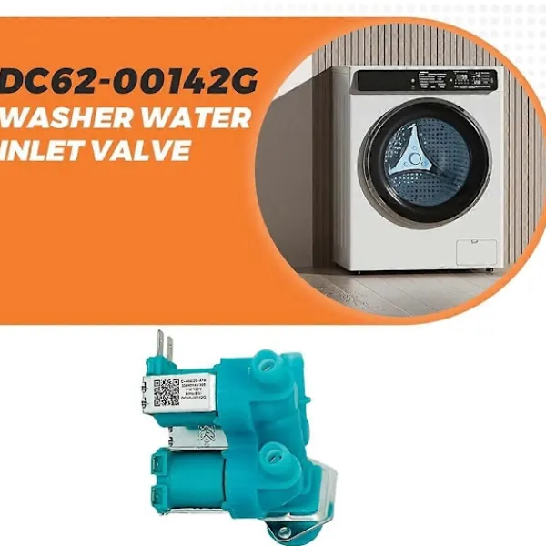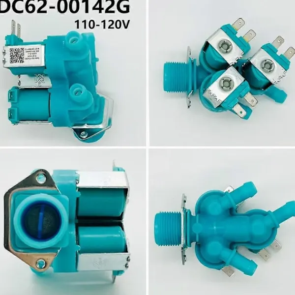 DC62-00142G Vatteninloppsventil styr vattenflödet in i tvättmaskinen. Enheten kan innehålla flera delar. Dra bara upp maskinens ovansida, dra upp gamla delar, installera nya, knäpp fast och sätt tillbaka maskinen i bruk snabbt. Om din tvättmaskin låter, läcker, inte fylls på eller töms dåligt, måste du byta ut tvättmaskinens inloppsventil DC62-00142G