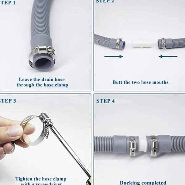 Perfekt matchning: Änden av avloppsslangen passar perfekt med tvättmaskinens utlopp och kan enkelt installeras utan verktyg. Användningen av förlängningsadaptern gör att du kan expandera de två rören kan anslutas ordentligt och perfekt utan verktyg, och det är mycket säkert utan att oroa dig för vattenläckor eller vattenläckage.