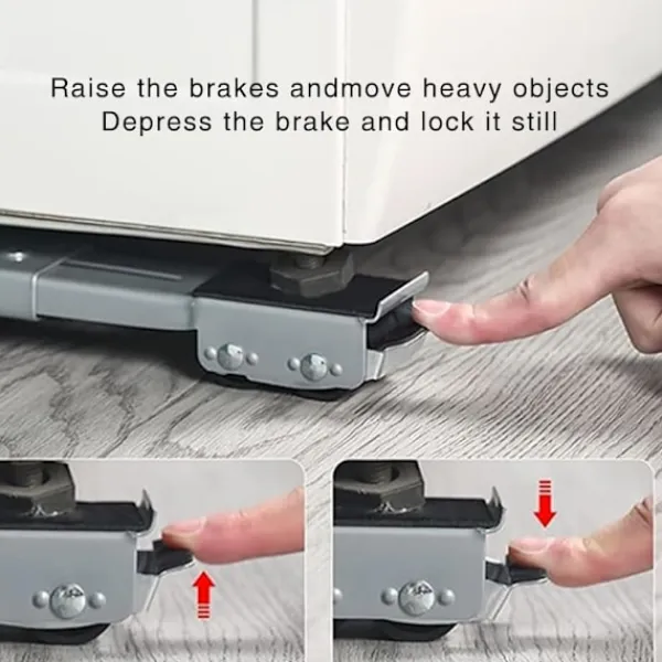 4. Säker låsning: Den kompakta tvättmaskinsflyttaren levereras med en bromsfunktion som säkerställer att möblerna står stilla när de inte används, vilket ger ett extra lager av säkerhet.