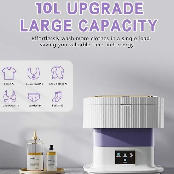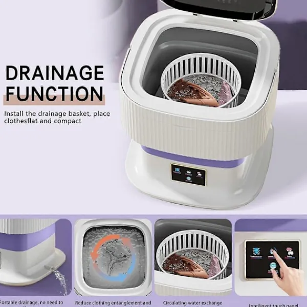 Vikbar och Utrymmesbesparande: Den vikbara funktionen hos denna vikbara mini tvättmaskin möjliggör enkel förvaring, vilket gör den perfekt för små lägenheter, studenthem eller husbilar där utrymmet är begränsat.
