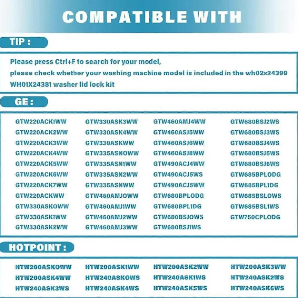 [ERSÄTTNINGSDELSNUMMER] WH02X24399 WH01X24381 tvättmaskinslock kit kompatibelt med för och Hotspot toppmatad tvättmaskin locklåsbrytare ersättningsdelar. [SPARA DINA PENGAR] Tvättmaskinslock kit kan enkelt lösa problemet att dörrbrytaren på tvättmaskinen är skadad och inte kan låsas. Du behöver bara spendera lite pengar för att byta ut delarna, vilket avsevärt kan förbättra tvättmaskinens funktion. [KOMPATIBEL MODELL] W11307244 tvättmaskinslock brytarenhet ersätter artikelnummer: GTW460ASJ5WW, GTW460ASJ6WW, GTW460ASJ6WW, GTW460ASJ8WW, GTW335ASN1WW, GTW220ACK1WW, GTW220ACK2WW, GTW220ACK3WW, GTW220ACK4WW, GTW220ACK5WW, GTW220ACK6WW, GTW220ACK7WW, GTW220ACKWW, GTW330ASK0WW, GTW330ASK1WW, GTW330ASK2WW, GTW330ASK3WW, GTW330ASK4WW, GTW330ASKWW, GTW335ASN0WW, GTW335ASN2WW, GTW335ASNWW, GTW460AMJ0WW, GTW460AMJ1WW, GTW460AMJ2WW, GTW460AMJ3WW, GTW460AMJ4WW, HTW240ASK0WS, HTW240ASK1WS, HTW240ASK2WS, HTW240ASK3WS, HTW240ASK4WS, HTW240ASK5WS, etc.