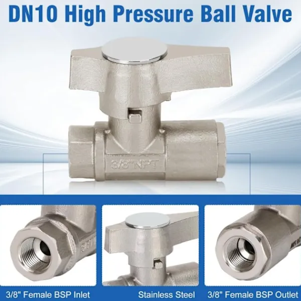 DN10 kulventiler 5000psi för högtryckstvättspistoler är tillverkade av lättviktsmaterial, 3/8in invändiga inlopp x 3/8in invändigt utlopp med rund ram. Kulventiler högtryckstvätt med unik design tål högt tryck. Högtryckstvättens kulventiler kan användas för högtryckstvättslangar, pistoler, pumpar och munstycken.