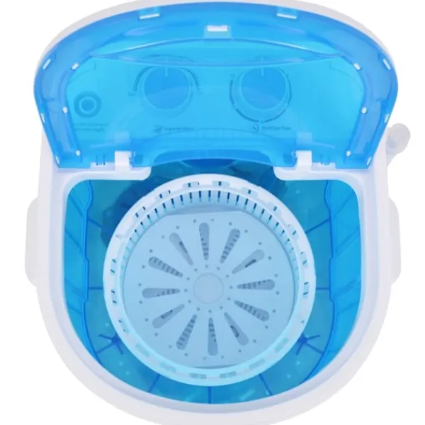 Denna utrymmes- och kostnadsbesparande minitvättmaskin är perfekt för studenter, på campingen eller i begränsade utrymmen såsom små kök, husvagnar och husbilar. Tvättmaskinen har en tvättkapacitet på 2,6 kg och en centrifugeringskapacitet på 2 kg. Dess inbyggda 15 minuters timer stänger automatiskt av maskinen efter varje tvätt- eller centrifugeringscykel. Tack vare det praktiska bärhandtaget är minitvättmaskinen väldigt enkel att ta med sig och är perfekt för att använda på resan eller campingen. Vår minitvättmaskin levereras tillsammans med en dräneringsslang som gör att du enkelt kan tömma ut vattnet efter tvätt. Leveransen omfattar även en slang för tillförsel av vatten.
